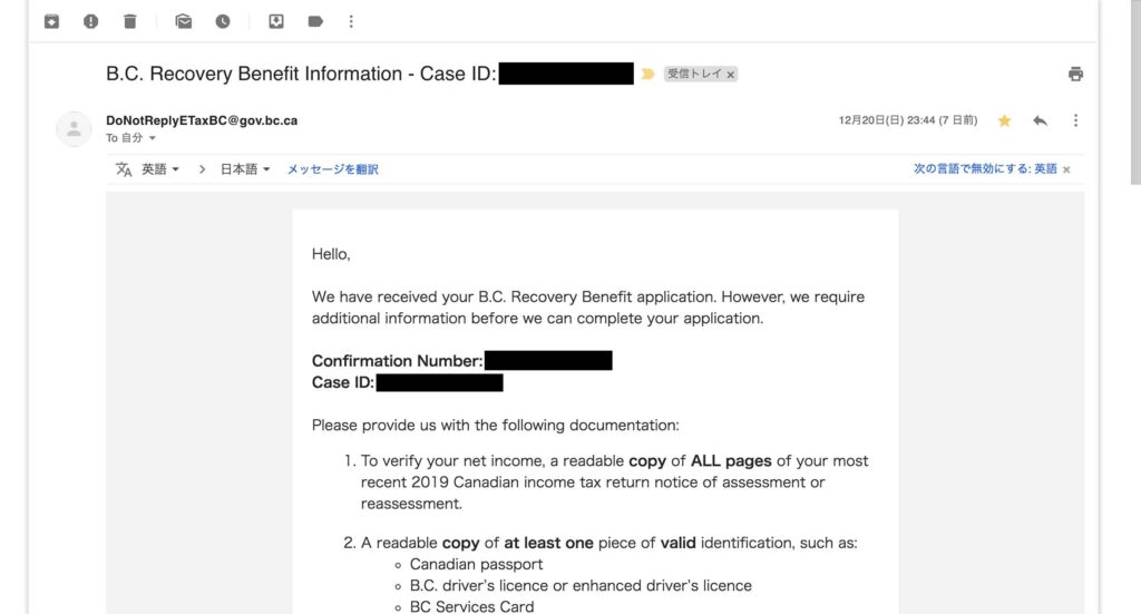 まず BC Recovery Benefit が受給されない人は BC 政府から『B.C. Recovery Benefit Information – Case ID: x-xxx-xxx-xxx』のメールが来ているの確認して下さい(x は数字になります)。