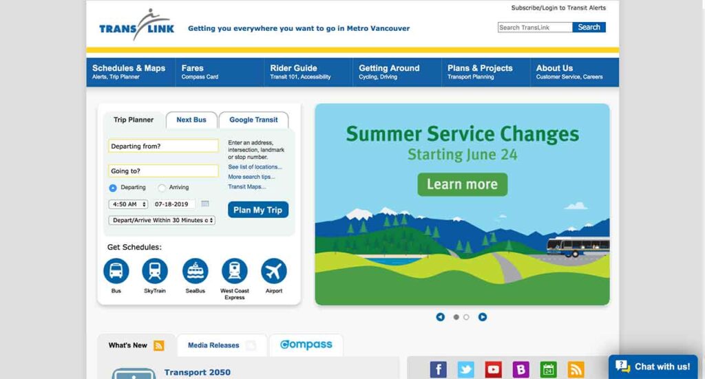 Translink(トランスリンク)とは、カナダのバンクーバーにある公共交通機関を提供している会社で、通勤や通学などの日常的に使用するバスやSkyTrain(電車)などの通勤手段を提供しています。