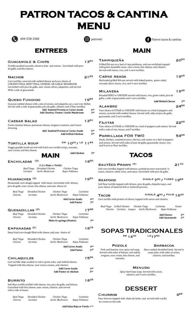 公式ホームページ:Patron Tacos & Cantina | Vancouver, BC | (604) 558-3368