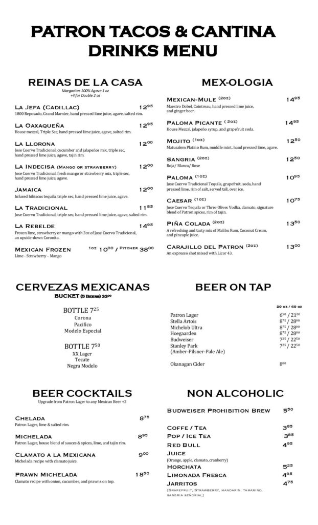Patron Tacos & Cantina のメニューの一覧を下記に貼っておきますね。