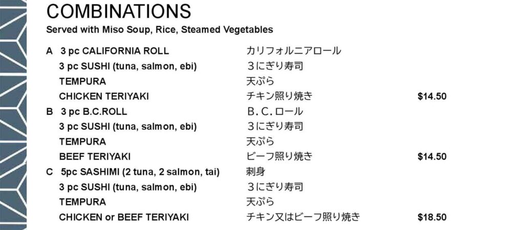 僕が注文をした料理・飲み物は「Mixed Combo with BC Roll」です。