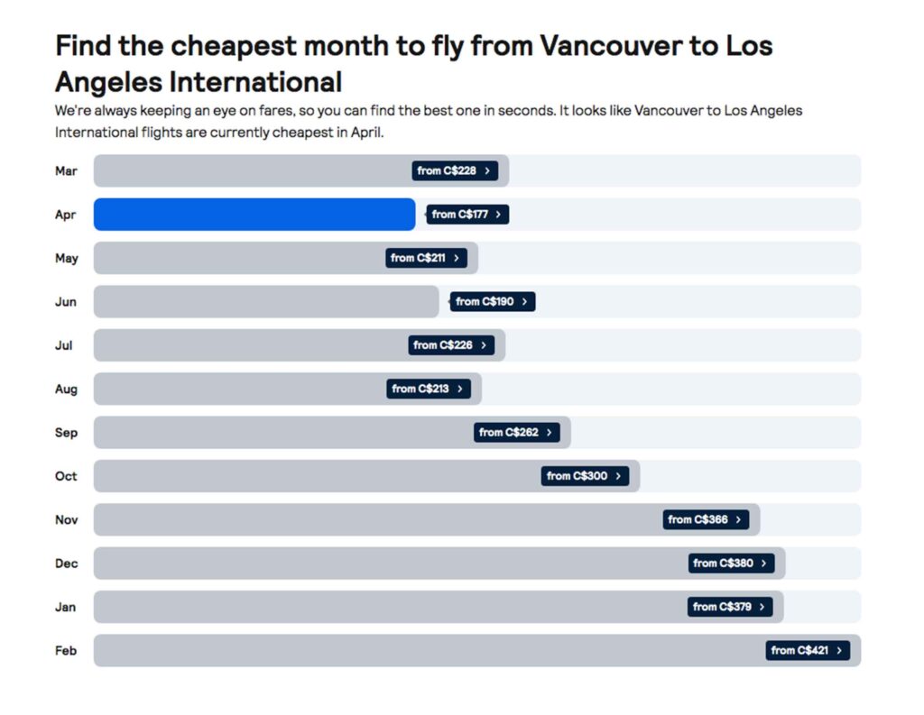 - バンクーバー – ロサンゼルス間往復平均料金:約$280