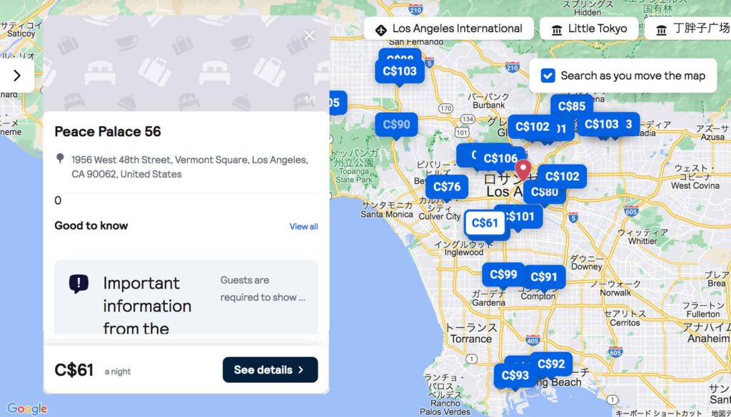 ロサンゼルスの1泊の宿泊費用はピンキリで、$60から$1,500と幅広い料金です。