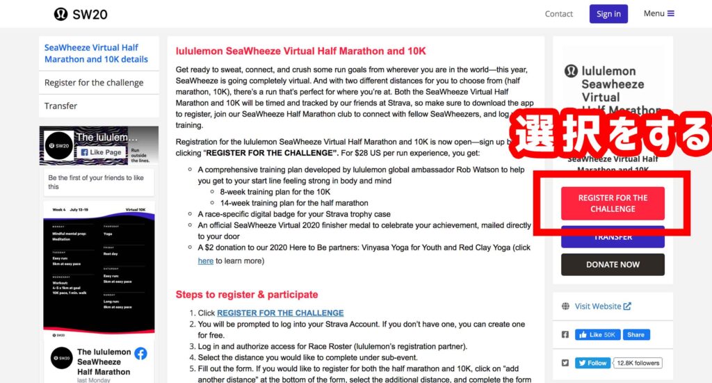 1.2020 ― SeaWheeze Virtual Half Marathon and 10K ― Race Roster ― Registration, Marketing, Fundraising のサイトへアクセスをして【REGISTER FOR THE CHALLENGE】を選択します。