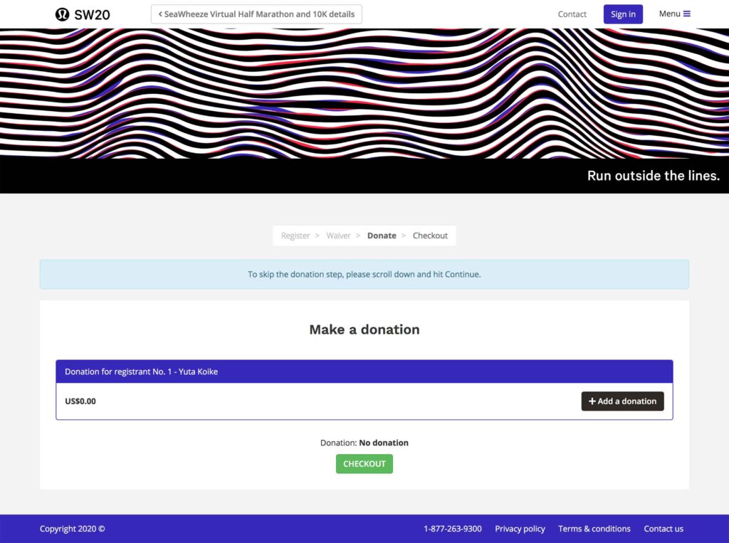 5.寄付のページに遷移します。ルルレモンが支援をしているヨガの団体へ寄付をしたい人は【Add a donation】から寄付をすることができます。