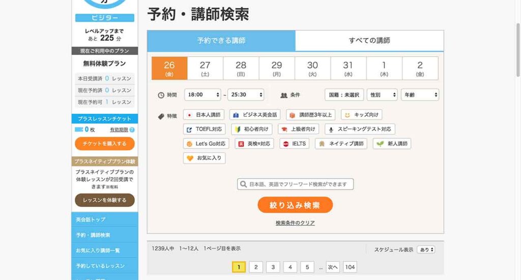 予約・講師検索から講師の予約をします。日にち、時間、条件(国籍、性別、年齢)や特徴(初心者向け、ビジネス英会話、日本人講師など)を選択し、条件に合う講師を選択します。