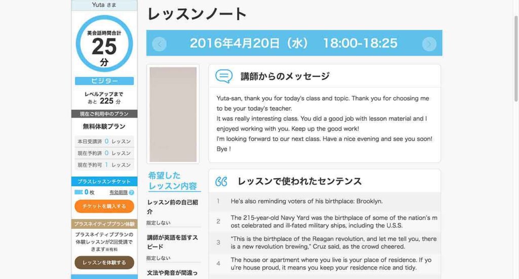「DMM英会話」終了後、レッスンをした講師の方からメッセージとセンテンス、単語が「レッスンノート」に記載されますので、「レッスンノートを」見ながら復習をすることが出来ます😌