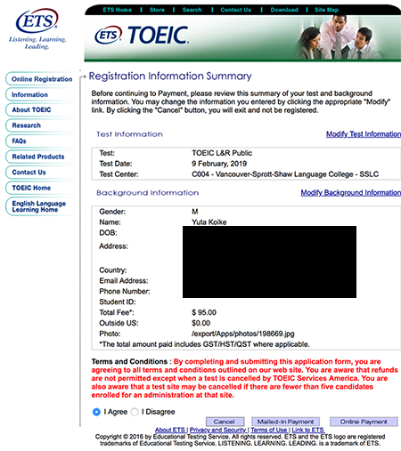 - カナダ以外の国にTOEICの結果を送る(別途$5必要)か送らないか