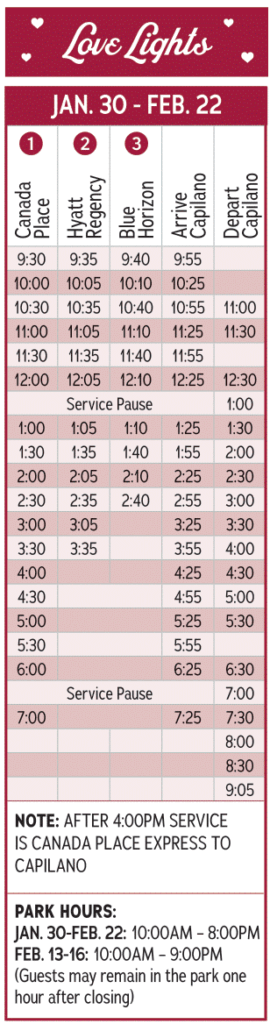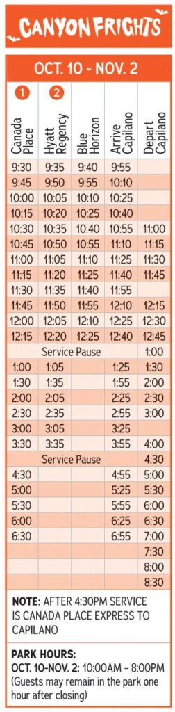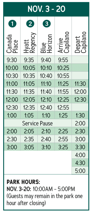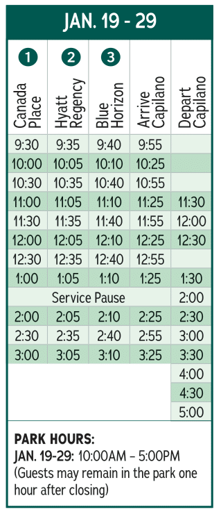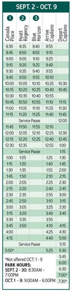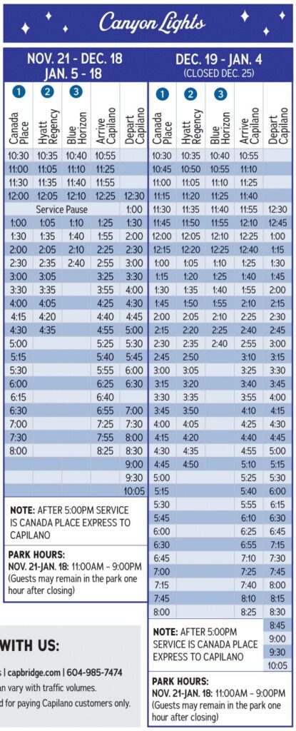 キャピラノ吊り橋無料シャトルバスの現在のスケジュールは下記の通りです🚏