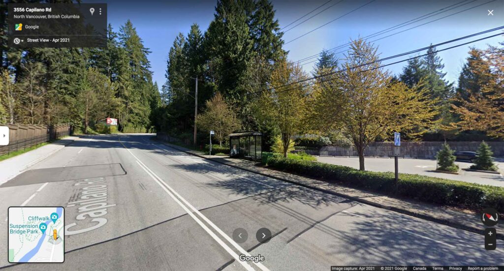 SeaBus下車後に近くのバス停で「236 Grouse Mtn」行きのバスに乗り「NB Capilano Rd @ 3600 Block」で下車すると、目の前にキャピラノ吊り橋があります🚌