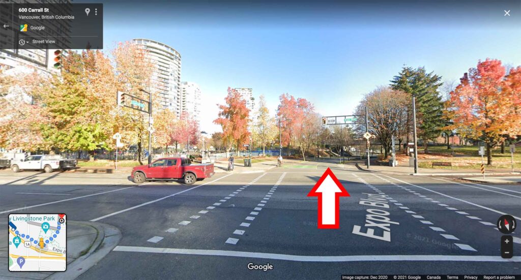 真っ直ぐ進むと「ŠXʷWƏQ̓ʷƏΘƏT Crosstown Elementary School」という小学校があり、小学校の角(Carrall St)を左へ曲がる