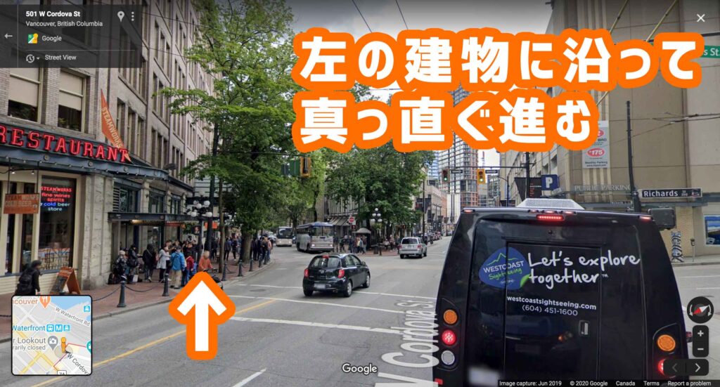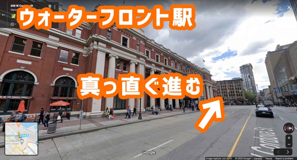 1.バンクーバーのダウンタウンにある「ウォーターフロント駅(Waterfront Station)」から「 W Cordova St」を画像が示している矢印の方向へ歩きます🚶