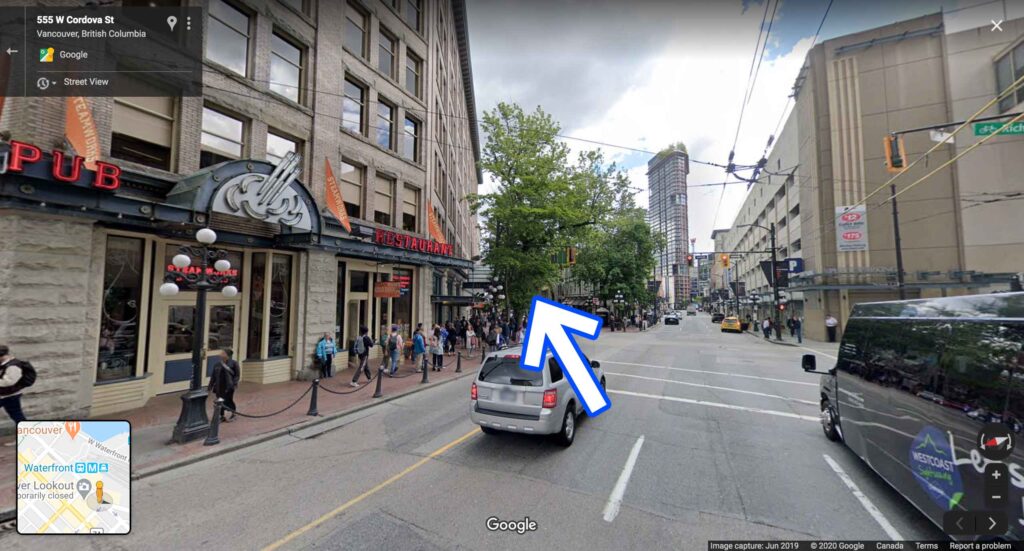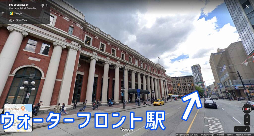 1.ウォーターフロント駅からW Cordova Stを歩きます。(歩きで約20分ほどで着きます)