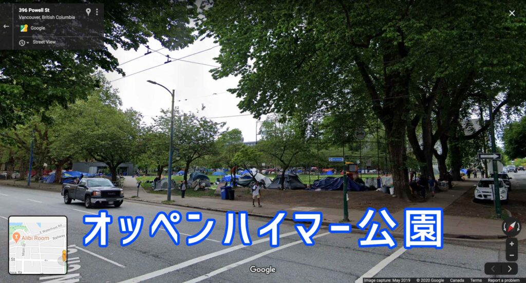 ジャパンタウンの場所は「オッペンハイマー公園(Oppenheimer Park)」という現在多くのホームレスが滞在をしている公園の周辺地帯にありますので、オッペンハイマー公園への行き方をお伝えします。(※オッペンハイマー公園、そしてその周辺はヘイスティングス通り(Hastings St)などの危険な地域なので、決して1人では行かないようにしましょう。)
