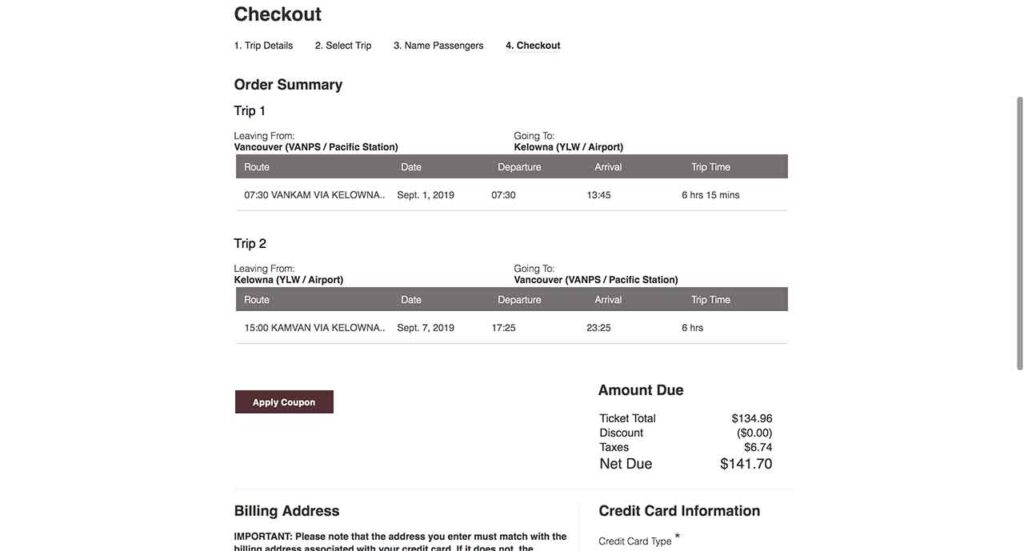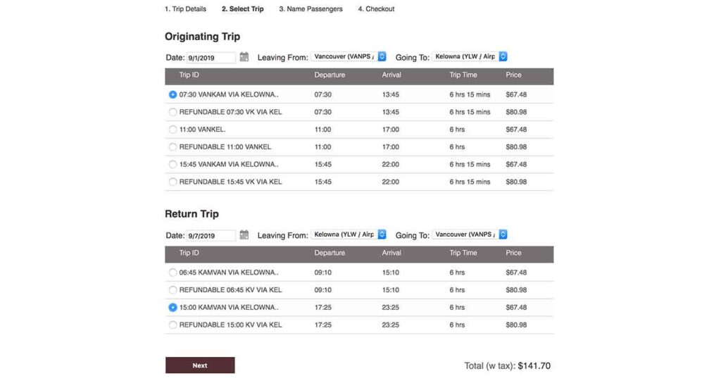 バンクーバーからカムループスまでのE BUSの料金は下記の通りです。