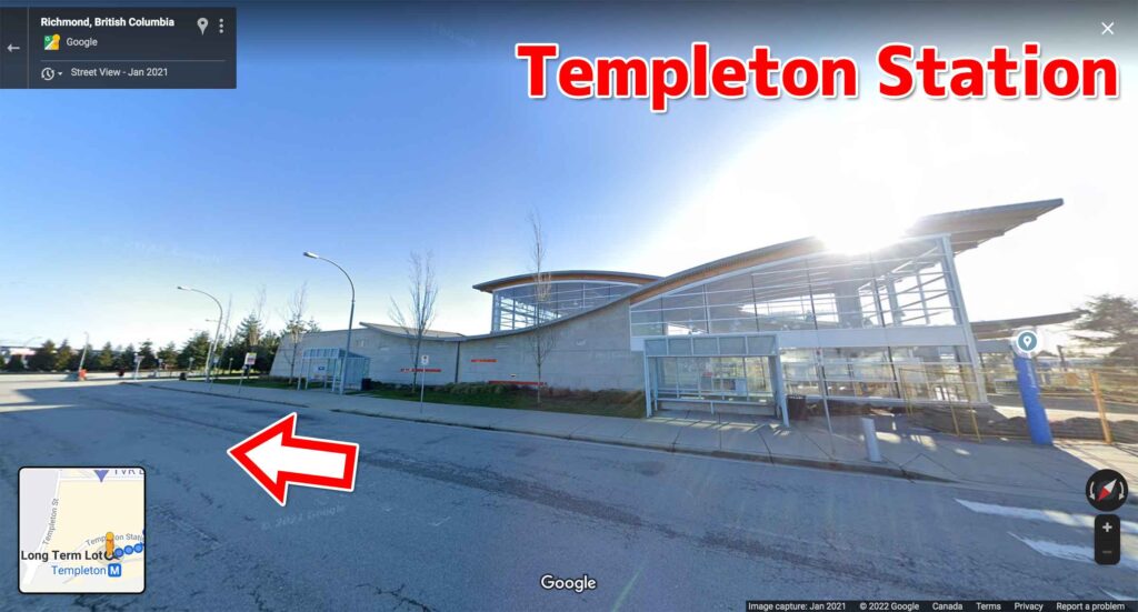 場所はバンクーバーの電車「スカイトレイン(Sky Train)」のカナダライン(Canada line)にある駅「Templeton Station」から徒歩5分ほどの場所にあります🚃