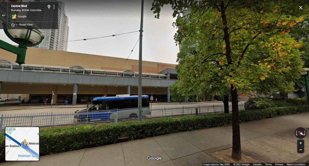 Metrotown Station の目の前にあるショッピングモールの入り口付近にバス停あり